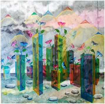 Carlo Dezzani ha realizzato uno dei suoi paesaggi onirici ai quali ci ha abituato quando ‘gioca’ su equilibri impossibili, fa stare le case dentro